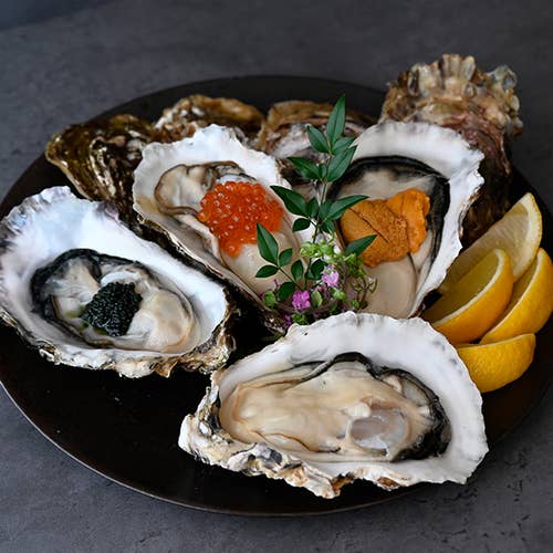老舗魚屋直送の極上牡蠣にキャビアや雲丹を添えて。